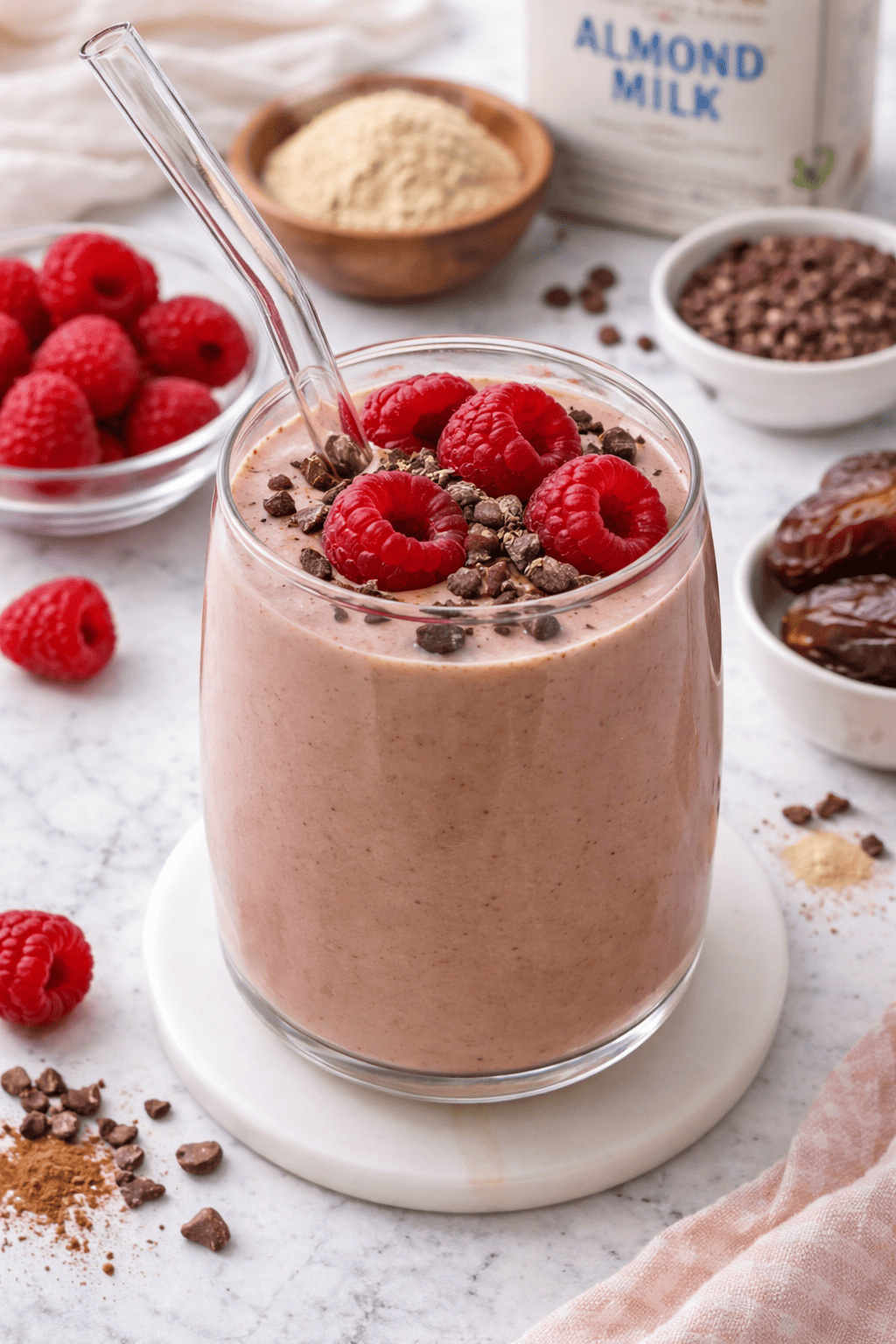 Pokud chceš hustší smoothie, přidej méně mléka. Pokud chceš pítelnější, dolij. - Nalij do sklenice a navrch přidej maliny + pár kakaových bobů pro extra „crunch“.